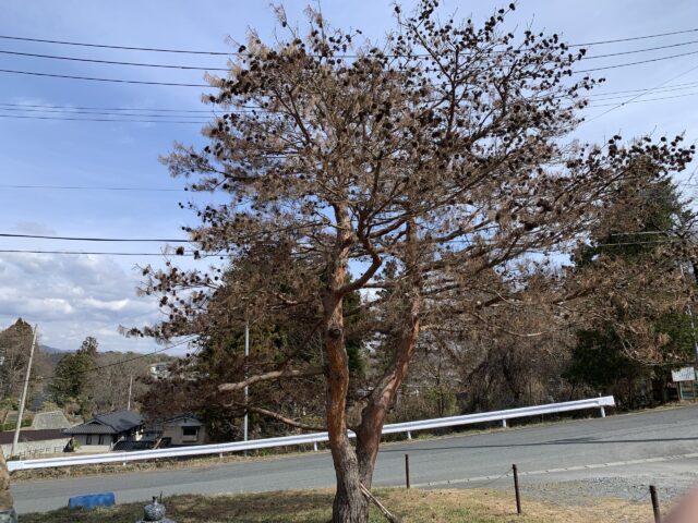 マツクイムシ病を再発させないためには、マツノマダラカミキリの幼虫が枯れた松に潜んでいる冬のうちに、松を伐採してチップ化し幼虫ごと始末しないといけないのです。なので、本当は枯れた松をそのままにしておくことは絶対に避けなければならないのです。